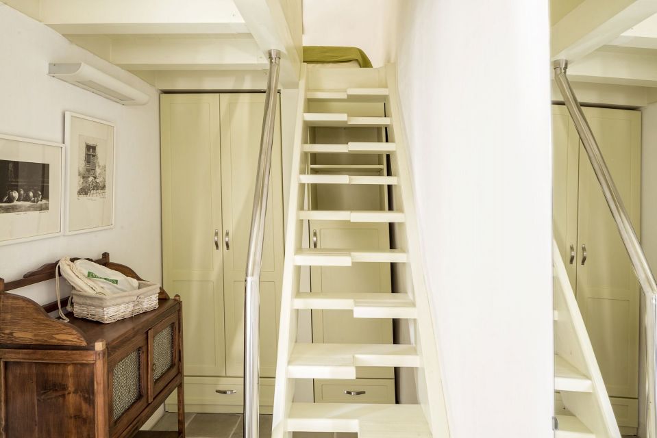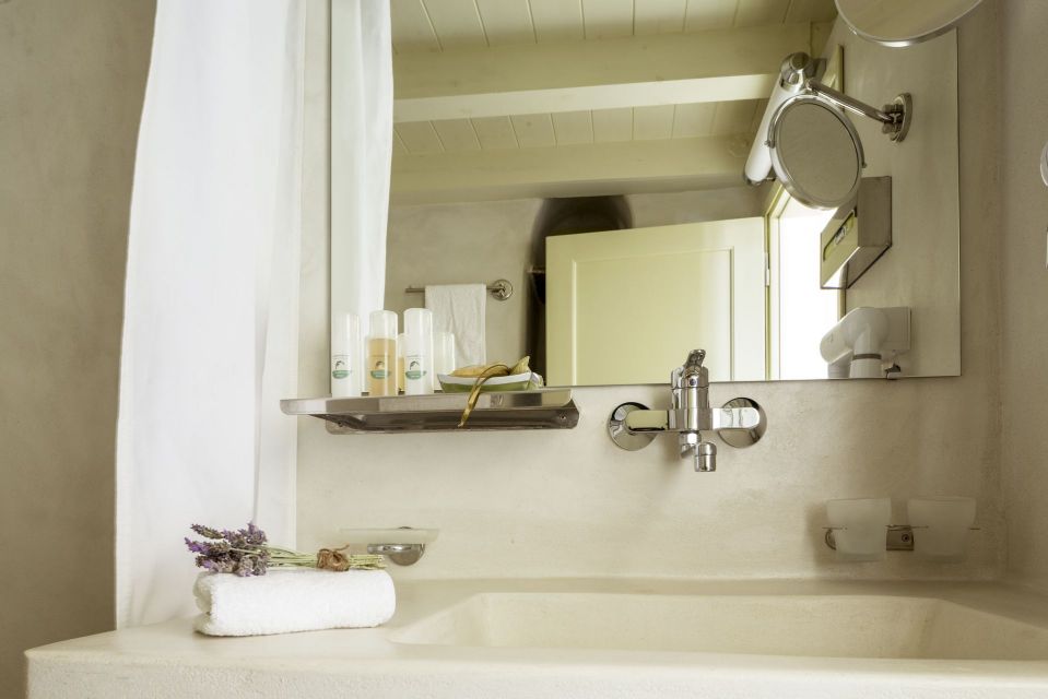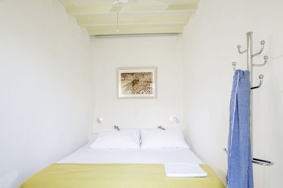 Ascend the wooden staircase to the loft level, where you'll find a delightful twin bedroom with two single beds, side by side – perfect for children. A small balcony on this level offers breathtaking views of the Aegean Sea, the island of Delos, and the surrounding Tinos landscape.
