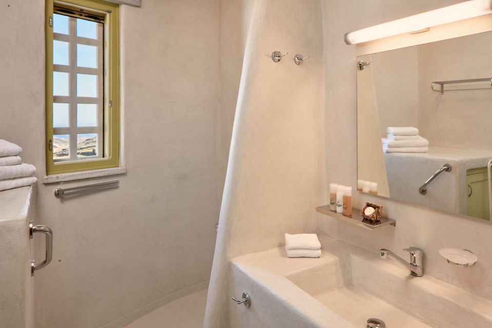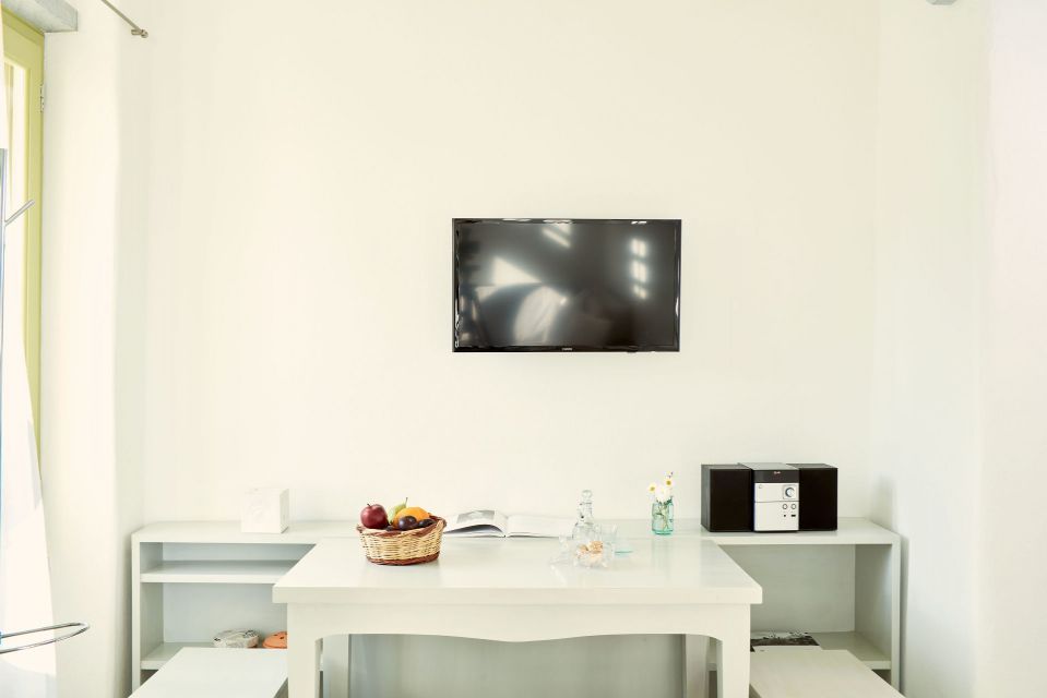 Perched on the upper level of a building complex of our countryside boutique hotel, the Vista Quarters truly lives up to its name ("Ano Thea" in Greek means "Upper View"). The spacious living area features a comfortable dining and sitting area, where two comfortable sofas conveniently convert into single beds with premium mattresses, ensuring a restful stay for up to four guests. The bedroom, with a built-in double bed, boasts a private small balcony, with stunning views of the Aegean Sea and the island of Delos. A fully equipped kitchen is perfect for preparing light meals and snacks. The modern bathroom includes a refreshing shower and complimentary all the necessary accessories and toiletries.